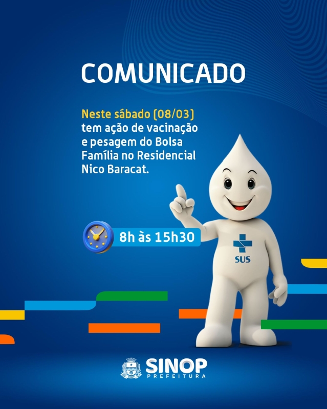 Outra agenda do setor também já definida para março é a ação de vacinação, no próximo dia 08 (sábado), no Residencial Nico Baracat, na qual também será realizada pesagem do Bolsa Família, das 08h às 15h30.